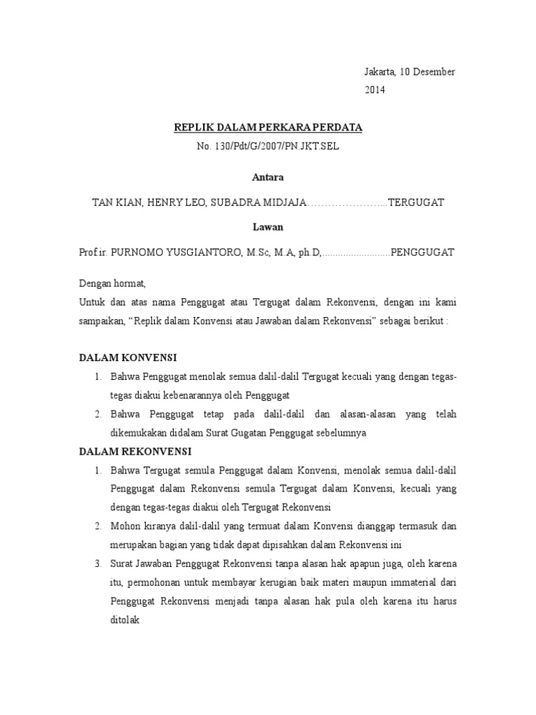 Duplik Tergugat I By Senarai Id Issuu from image.isu.pub Contoh surat jawaban atas gugatan untuk berbagai perkara hukum yang dapat diunduh secara lengkap dan gratis tanpa perlu daftar. Doc contoh replik dan duplik dalam. Eksepsi / jawaban tergugat banda aceh, 17 september 2014. Bahwa semua yang tergugat iv dan v kemukakan pada bagian eksepsi merupakan bagian yang tidak terpisahkan dengan pokok perkara ini Wanprestasi adalah suatu keadaan dimana seorang debitur tidak melakukan janji. Contoh (eksepsi) surat keberatan dalam perkara pidana. Contoh surat gugatan wanprestasi dari mata kuliah praktik beracara hukum pada pengadilan perdata hutang piutang. Pidato laporan pidato laporan adalah pidato yang isinya tentang laporan suatu tugas, pekerjaan atau kegiatan lainnya.